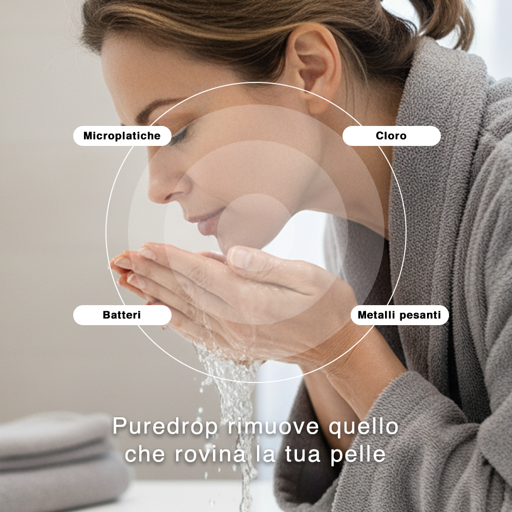 L’acqua del rubinetto contiene cloro e altre impurità che irritano e seccano la pelle. PureDrop™ rimuove queste sostanze, rendendo l’acqua più delicata e adatta alla skincare quotidiana.