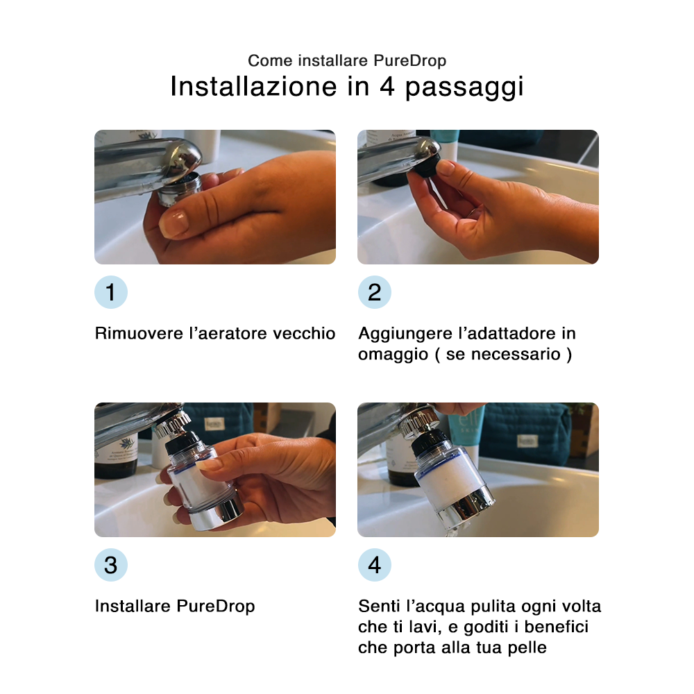 L’installazione è semplicissima e richiede meno di 5 minuti. Non servono strumenti né l’intervento di un idraulico: basta svitare l'aeratore originale e montare il filtro puredrop